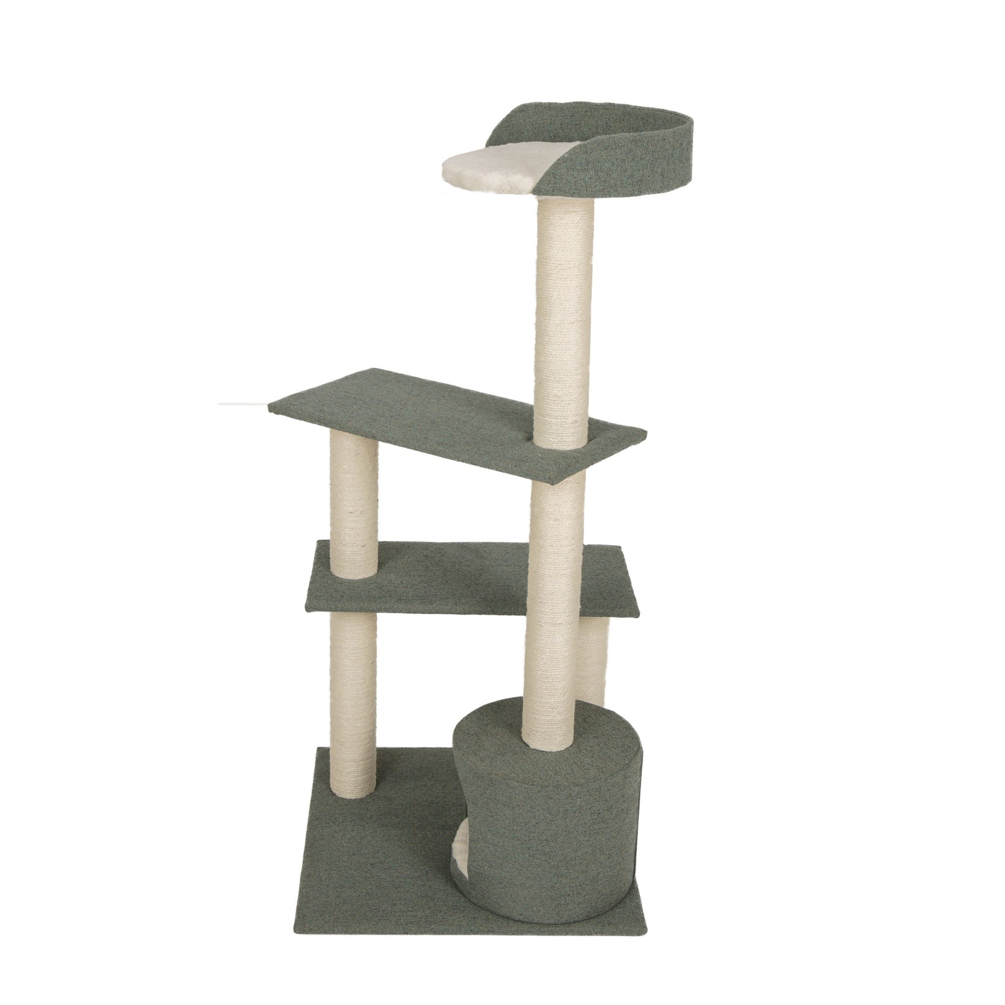 This cat tower features soft and sophisticated neutral green fabric and multiple levels that let cats get a view of their surroundings. Large platforms offer perfect sunny lounging spots while the base enclosures provides your feline friends an ideal place for a nap or hiding.